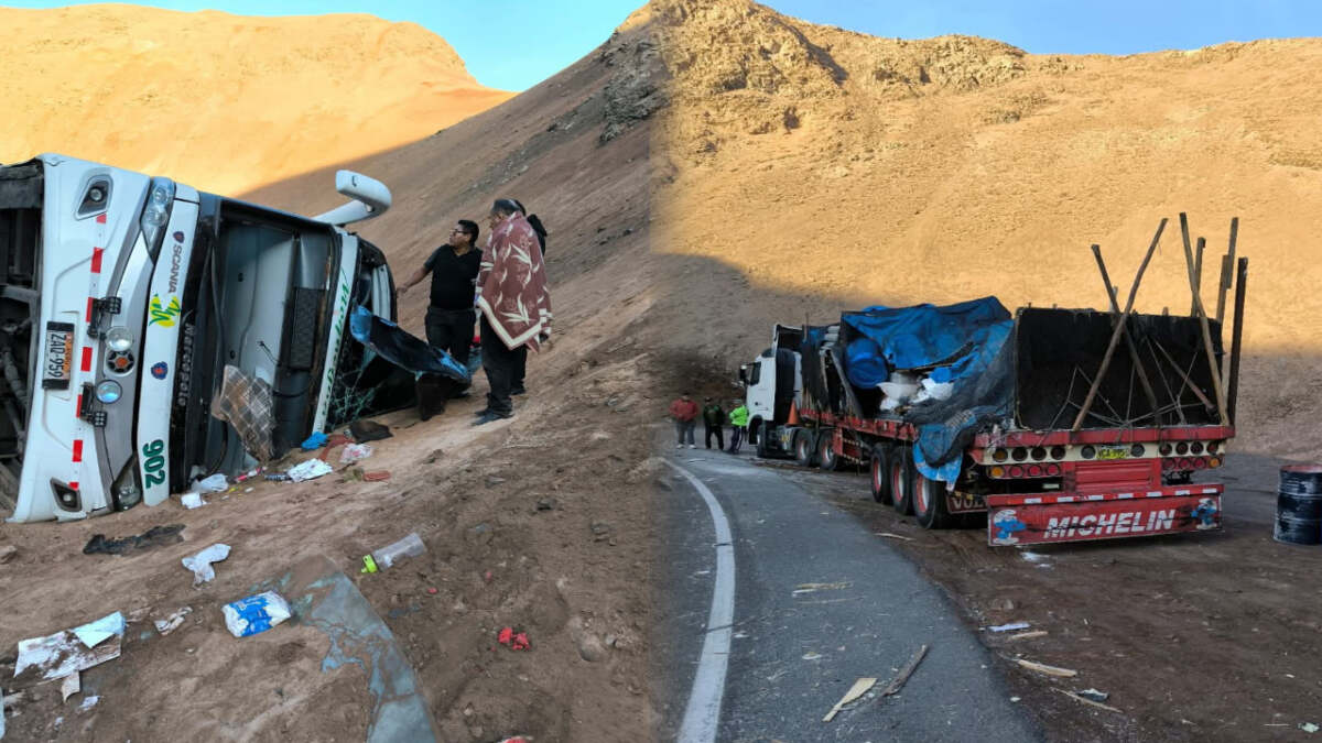 Arequipa – El violento choque y volcadura de un bus interprovincial de la empresa Transportes Moquegua (placa Z4Q-959) y un semi-tráiler (placa V4B-874) en el kilómetro 1057 de la carretera Panamericana Sur, sector El Fiscal, provincia de Islay, dejó un saldo de dos muertos y más de 30 heridos.