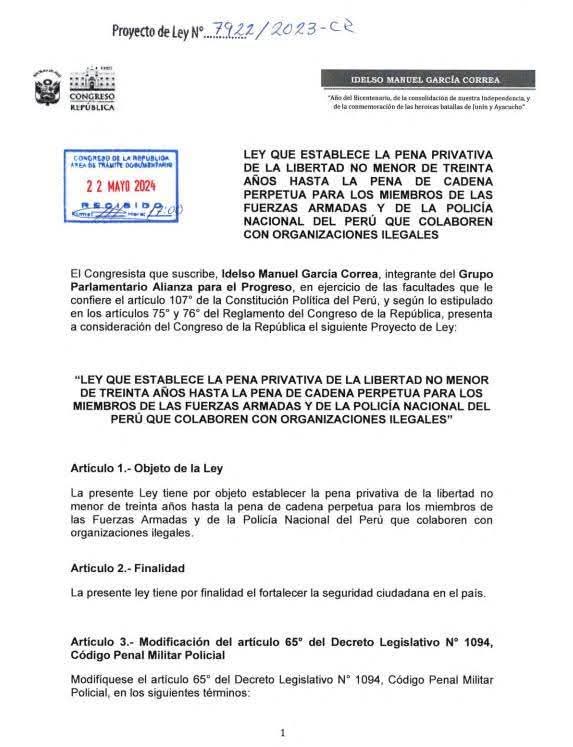 El Proyecto de Ley 7922/2023-CR, que propone esta modificación, establece que los integrantes de las FFAA y PNP que entreguen armamento, instruyan o cooperen con alguna organización delictiva serán castigados con severidad, especialmente si su accionar contribuye a la comisión de actos violentos que causen muertes o lesiones graves.