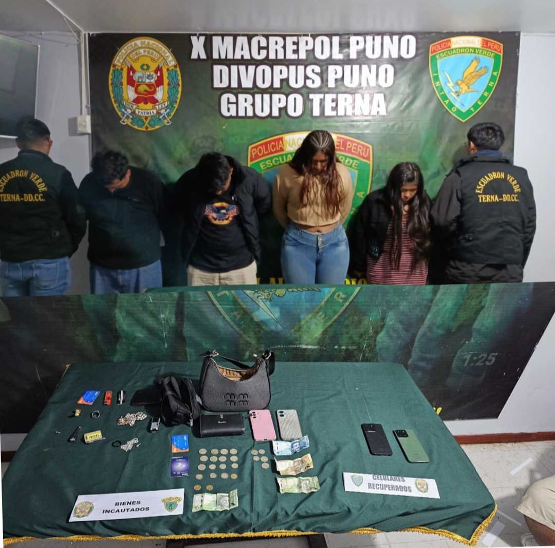 Puno, 14 de febrero 2026 – Agentes policiales intervinieron y detuvieron a cuatro presuntos integrantes de la banda criminal “Los Babys de Melgar”, implicados en la sustracción de teléfono celular en agravio de un ciudadano que se encontraba en situación de vulnerabilidad.