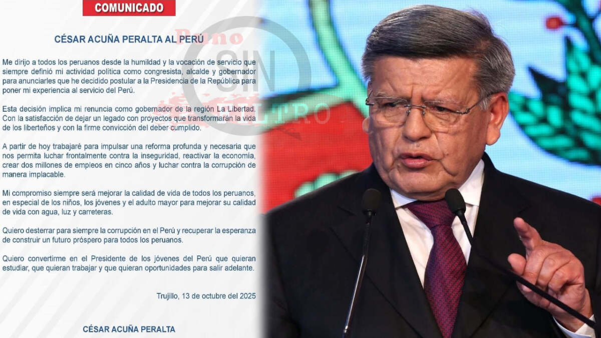 La Libertad, 13 de octubre 2025 – El gobernador regional de La Libertad, César Acuña Peralta, oficializó este lunes su renuncia al cargo para postular a la Presidencia de la República en las elecciones generales de 2026. La decisión llega en medio de críticas por su gestión regional, señalada por la falta de obras de impacto, retrasos en proyectos de infraestructura y cuestionamientos por presunto uso político del aparato regional.