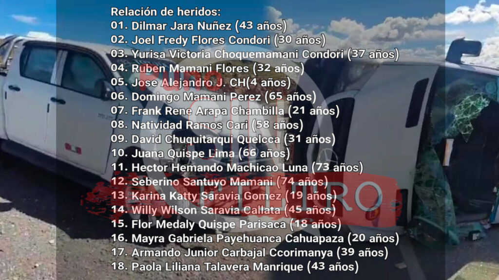 Entre los heridos más graves figuran Juana Quispe Lima (66), quien presenta fractura en el brazo izquierdo y hematoma cerebral; David Chuquitarqui Quelcca (31), con fractura en la pierna izquierda y múltiples contusiones; y Natividad Ramos Cari (58), con fractura en el brazo izquierdo y traumatismo encéfalo craneano leve.
