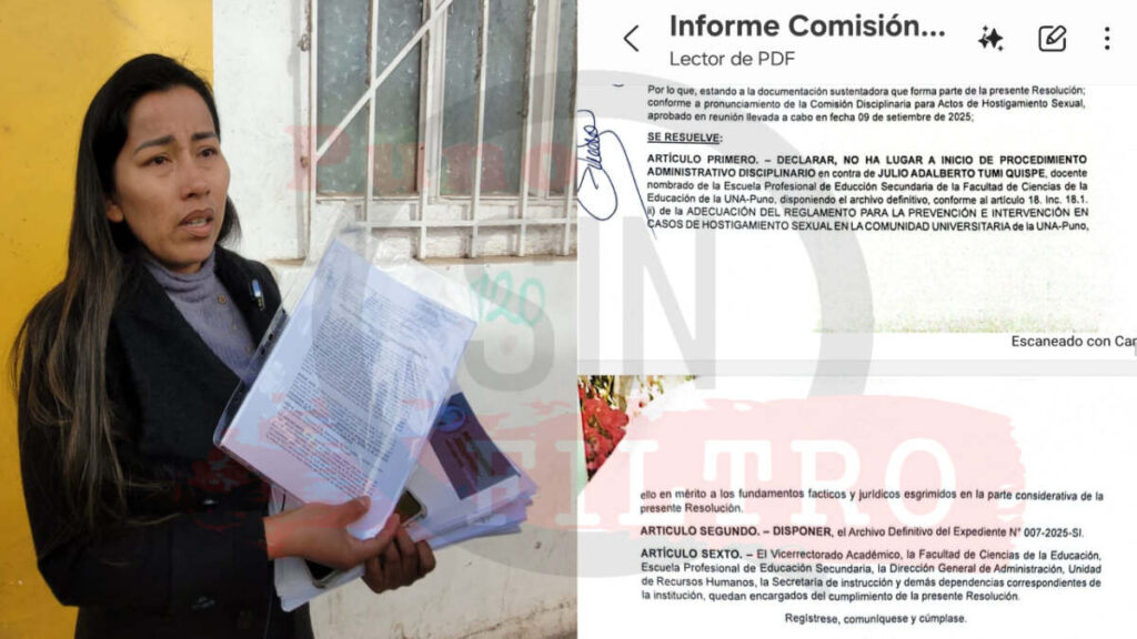 Puno – La Comisión Disciplinaria para Actos de Hostigamiento Sexual de la Universidad Nacional del Altiplano de Puno archivó la denuncia presentada por la profesional Judith Bautista Quispe contra el docente Julio Adalberto Tumi Quispe.