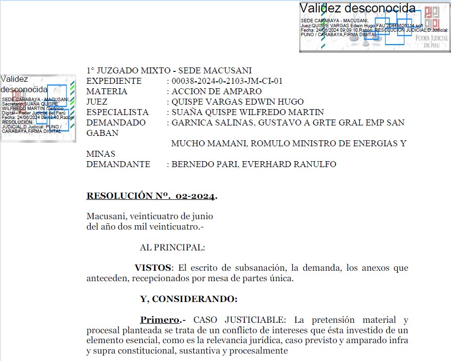 Ollachea, 15 de julio de 2024 – La comunidad campesina Ollachea ha iniciado un Proceso de Amparo contra las máximas autoridades del Ministerio de Energía y Minas (Minem) y la Empresa de Generación Eléctrica San Gabán, en defensa de sus derechos vulnerados en el marco del proyecto hidroeléctrico San Gabán II.