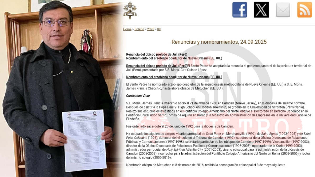 El breve comunicado, fechado este martes, indica que «el Santo Padre aceptó la renuncia al gobierno pastoral de la prelatura territorial de Juli (Perú), presentada por S.E. Mons. Ciro Quispe López». El anuncio se realizó en el apartado «Rinunce e Nomine» de la Santa Sede.