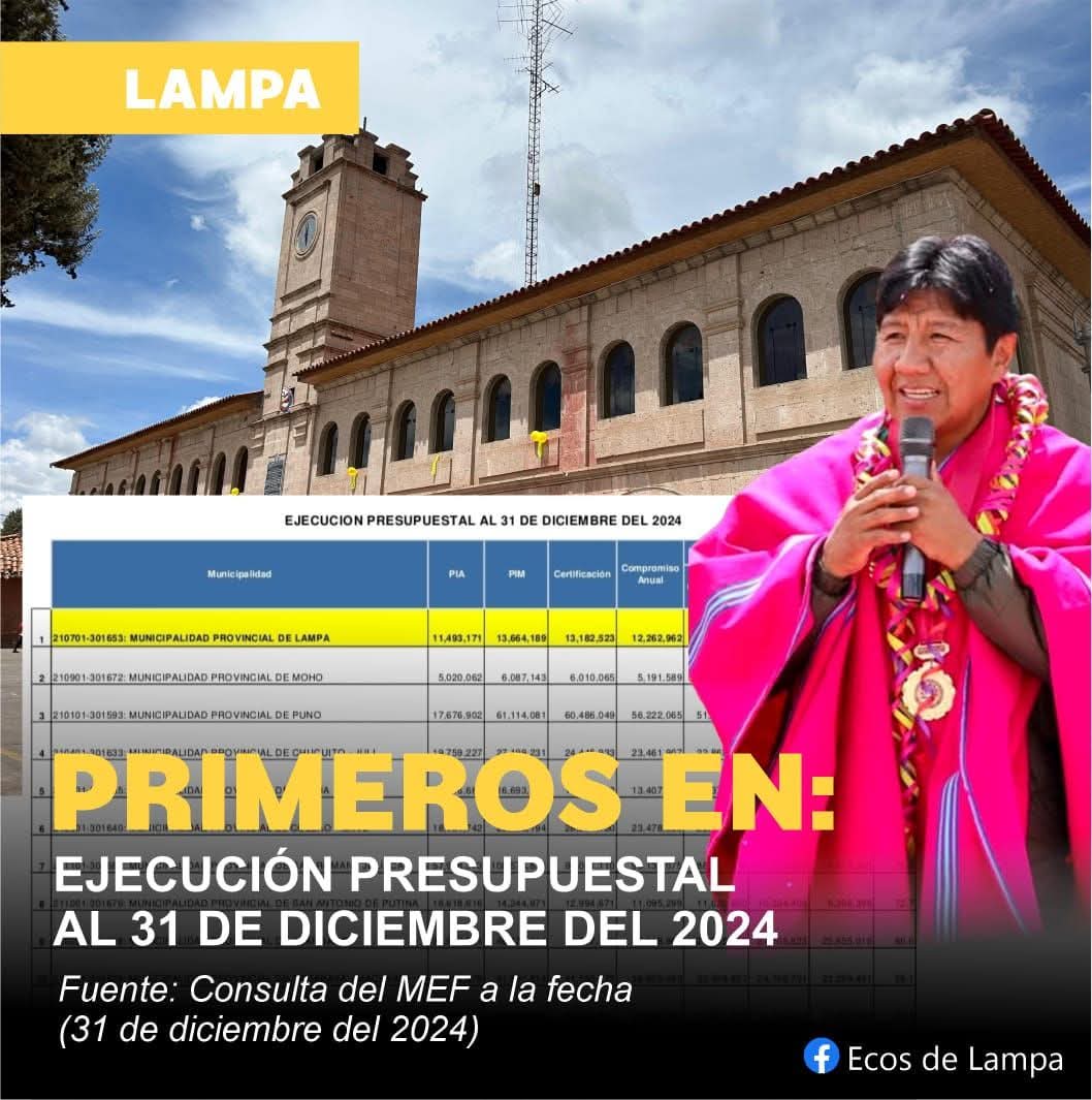 Lampa – Al cierre del 31 de diciembre del 2024, la Municipalidad Provincial de Lampa encabezado por su Alcalde Provincial, Heraclides Ojeda Huarilloclla 11 millones 867 mil 674 soles de los más de 13 millones de soles que se le destinó en su Presupuesto Institucional Modificado – PIM, lo que lo ubica en primer lugar en ejecución presupuestal.