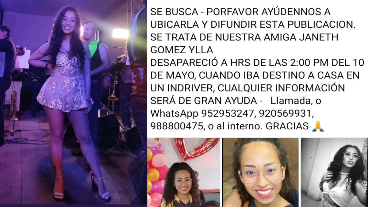 Nacional – Janeth Gómez Ylla (26), cantante que había sido reportada como desaparecida desde el sábado 10 de mayo tras abordar un taxi en Tacna, fue localizada sana y salva.