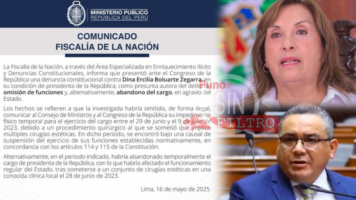 Lima – La Fiscalía de la Nación presentó dos nuevas denuncias constitucionales contra Dina Boluarte en menos de 24 horas. La primera la acusa de omisión de funciones y posible abandono de cargo por no informar oficialmente su ausencia por un procedimiento estético entre el 29 de junio y el 9 de julio de 2023. La Fiscalía argumenta que esta falta de comunicación afectó el funcionamiento del Estado.