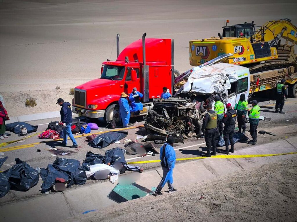 Moquegua – Un devastador accidente de tránsito registrado la noche del miércoles en la carretera Binacional cobró la vida de 14 personas, según el último reporte de la Superintendencia de Transporte Terrestre (SUTRAN). El siniestro ocurrió aproximadamente a las 8:00 p.m. en el sector de El Arenal, cuando una miniván de placa C9J-968 impactó en la parte posterior de una camabaja estacionada en la vía y luego de manera frontal contra un trailer encapsulado que se dirigía a Puno.