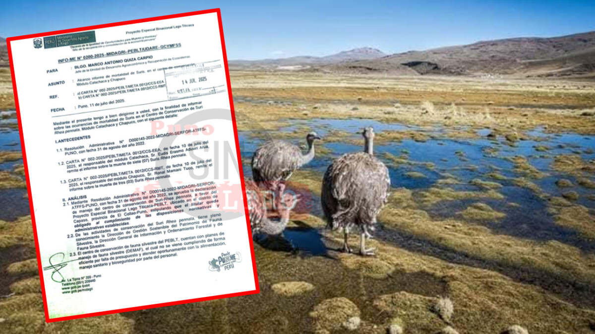 Puno, 18 de julio del 2025 – Un total de 21 suris (Rhea pennata), especie en peligro de extinción, murieron en los centros de conservación del Proyecto Especial Binacional Lago Titicaca (PEBLT), ubicados en Calachaca y Chapuco, según el informe N° 0200-2025-MIDAGRI-PEBLT/UDARE-GCYMFSS del Ministerio de Desarrollo Agrario y Riego.