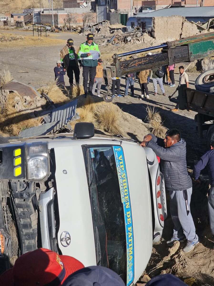 La combi, que viajaba de Juli a Puno, aparentemente perdió el control en una curva próxima al peaje, aunque las causas del accidente están bajo investigación. Así mismo, se presume falla mecánica o exceso de velocidad, los que ocasionaron daños considerables en el vehículo.
