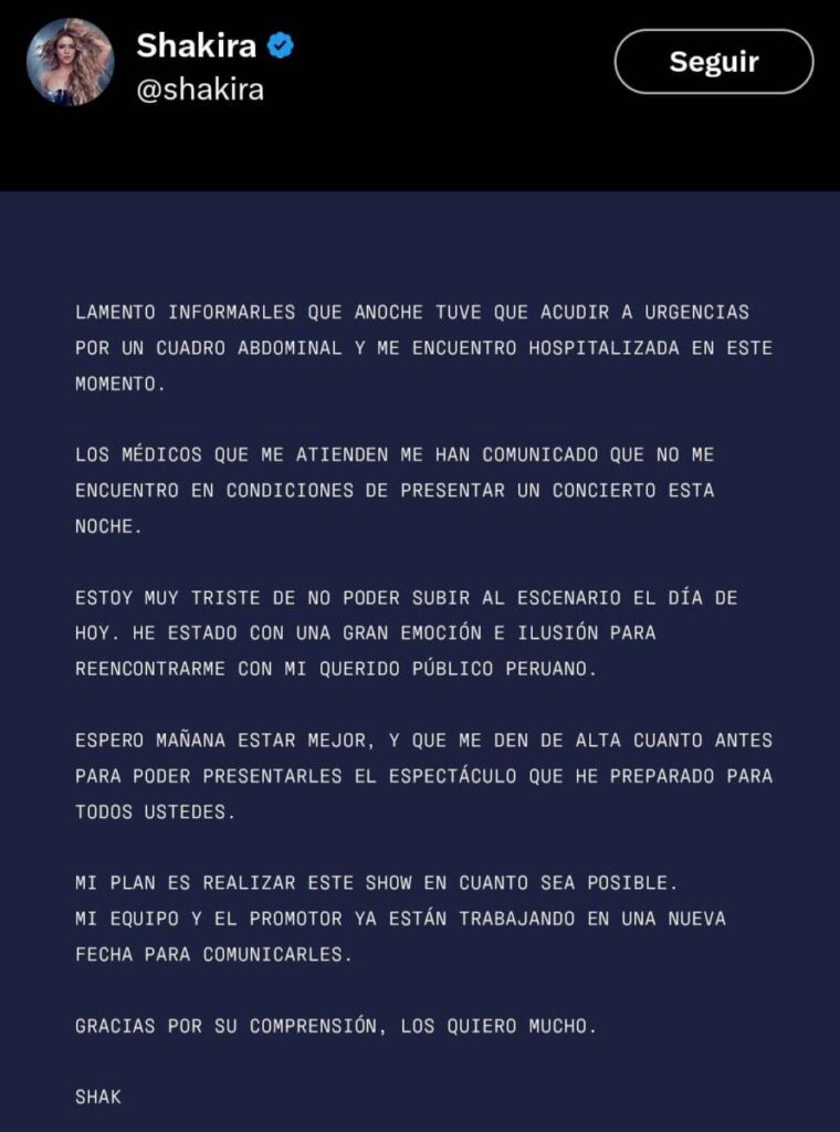Shakira expresó su tristeza por no poder subir al escenario hoy, ya que tenía mucha ilusión por reencontrarse con su público peruano.