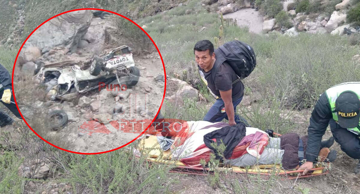 Arequipa – El fatal accidente de tránsito se registró esta tarde en la vía Arequipa – Puno, en el sector Quiscos, distrito de Yura. Un vehículo Toyota Hilux, de placa W5O-851, sufrió un despiste y volcadura, cayendo aproximadamente 500 metros hacia un barranco. El accidente dejó como saldo tres personas fallecidas y un herido.