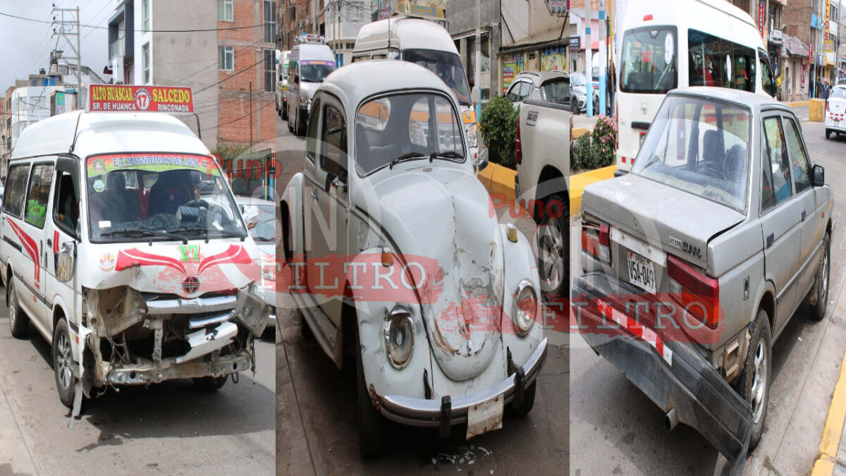 Puno – El triple choque se registró al promediar las 12:50 del mediodía de hoy en la intersección de la avenida La Torre y la avenida Floral, en la ciudad de Puno. El accidente involucró un Nissan color plomo de placa V5A-049, un Volkswagen blanco de placa BD-2183, y una combi de la empresa Magníficos del Sur (placa Z6W-905) que cubre la ruta Alto Huáscar-Salcedo.