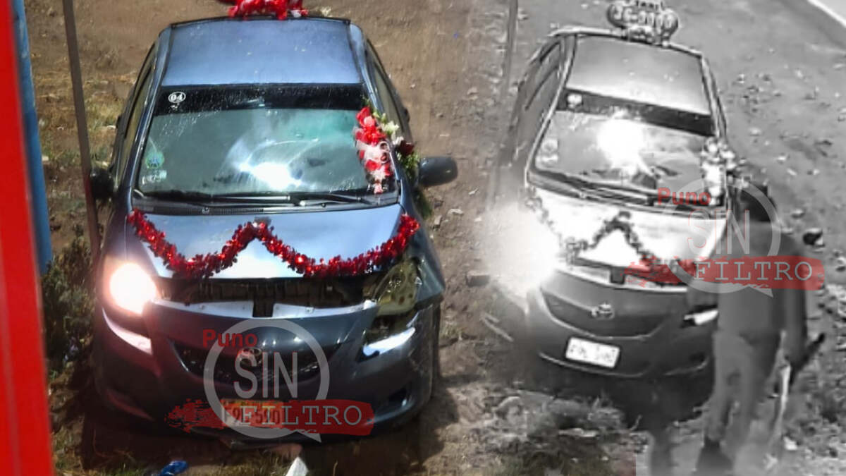 Se trata de un taxi de la empresa Titikaka Tours Puno, con placa de rodaje F9L-590, que se desplazaba por un costado de la vía hacia Yanamayo hasta colisionar contra una señal de tránsito con base de concreto. En el registro audiovisual se observa cómo el conductor desciende del vehículo, recoge algunas partes dañadas y revisa los daños. Luego intenta reincorporarse a la marcha, pero al no lograrlo de inmediato, vuelve a bajar, inspecciona nuevamente la zona y finalmente se retira del lugar.